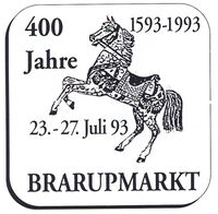 Weil Anno 1593 ein Bürger aus dem nahen Böel übermütig oder gar weinselig einem Brarup-Händler einen Topf zerschlug und dafür zur Strafe ein Brüchegeld entrichten mußte, deshalb konnte in Süderbrarup 1993 ein Jubiläumsmarkt gefeiert werden. Es ging dabei nicht um den vierhundertsten Brarup-Markt, denn der ist vermutlich wesentlich älter, aber bereits das 400-Jahre Jubiläum Brarup-Markt, das 1993 gefeiert wurde, kann sich sehen lassen.